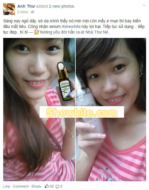 Là một người mẫu chụp hình thì việc có được làn da trắng là điệu mình rất mong muốn. Với làn da trắng hồng mình tự tin hơn hẳn khi đứng trước máy ảnh. Điều đó chỉ xuất hiện khi mình dùng sản phẩm Serum thanh lọc da của shewhite. Nhờ có sản phẩm này mà ước mơ của mình đã trở thành hiện thực.